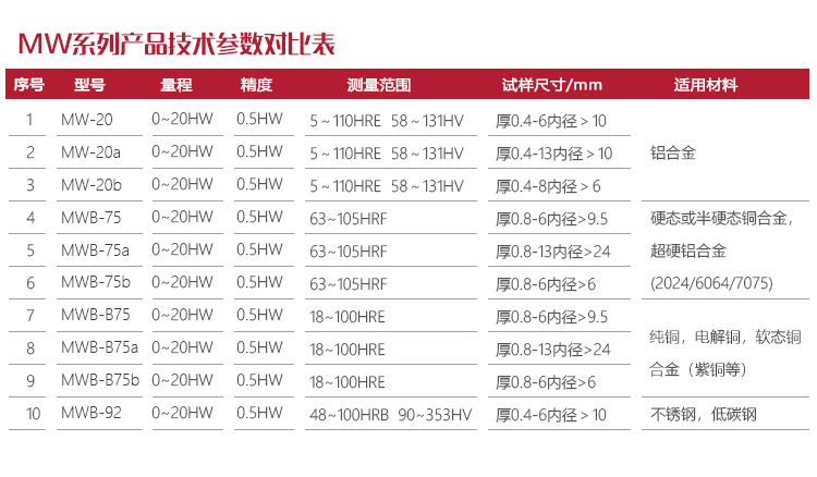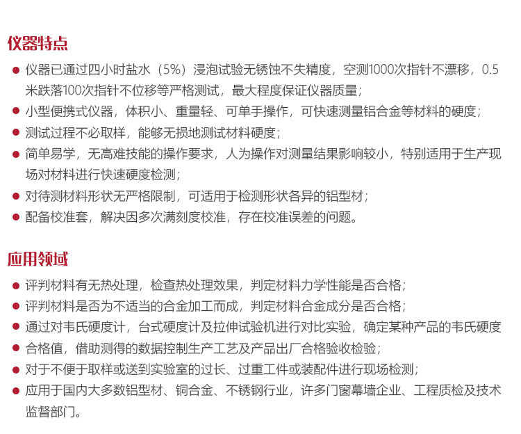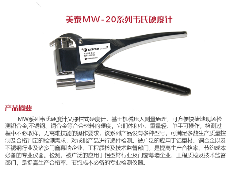 產(chǎn)品概述MW-20系列鋁合金系列韋氏硬度計(jì)又稱鉗式硬度計(jì),基于機(jī)械壓入測量原理,可方便快捷地現(xiàn)場檢測鋁合金材料的硬度。它們體積小、重量輕、單手可操作,檢測過程中不必取樣,無高難技能的操作要求。該系列產(chǎn)品設(shè)有多種型號(hào),可滿足多數(shù)生產(chǎn)質(zhì)量控制及合格判定的檢測需求,對(duì)成批產(chǎn)品進(jìn)行逐件檢測。被廣泛的應(yīng)用于鋁型材行業(yè)及諸多門窗幕墻企業(yè)、工程質(zhì)檢及技術(shù)監(jiān)督部門,是提高生產(chǎn)合格率、節(jié)約成本必備的專業(yè)儀器。