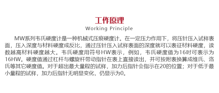 工作原理MW-20系列鋁合金系列韋氏硬度計(jì)是一種機(jī)械式壓痕硬度計(jì)。在一定壓力作用下,將壓針壓入試樣表面,壓針壓入試樣表面的深度與材料硬度成反比,通過杠桿與螺旋桿帶動(dòng)指針將壓入深度轉(zhuǎn)換為材料硬度值并在表盤上顯示出測量結(jié)果。韋氏硬度用符號(hào)HW表示,例如,韋氏硬度值為16時(shí)可表示為16HW。測得的韋氏硬度值可依據(jù)附表換算成維氏、洛氏等其它硬度值。對(duì)于超出最大量程的試樣,加力后指針會(huì)指示在表盤滿刻度值20的位置;對(duì)于低于最小量程的試樣,加力后指針無明顯變化,仍顯示為0。
