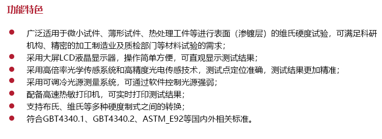儀器特點?廣泛適用于微小試件、薄形試件、熱處理工件等進行表面(滲鍍層)的維氏硬度試驗,可滿足科研機構、精密的加工制造業(yè)及質檢部門等材料試驗的需求;
