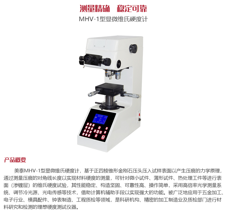 產(chǎn)品概述美泰MHV-1型顯微維氏硬度計(jì),基于正四棱錐形金剛石壓頭壓入試樣表面以產(chǎn)生壓痕的力學(xué)原理,通過(guò)測(cè)量壓痕的對(duì)角線長(zhǎng)度以實(shí)現(xiàn)材料硬度的測(cè)量,可針對(duì)微小試件、薄形試件、熱處理工件等進(jìn)行表面(滲鍍層)的維氏硬度試驗(yàn),其性能穩(wěn)定、構(gòu)造堅(jiān)固、可靠性高、操作簡(jiǎn)單,采用高倍率光學(xué)測(cè)量系統(tǒng)、調(diào)節(jié)冷光源、光電傳感等技術(shù),借助計(jì)算機(jī)輔助手段以實(shí)現(xiàn)強(qiáng)大的功能。被廣泛地應(yīng)用于五金加工、電子行業(yè)、模具配件、鐘表制造、工程質(zhì)檢等領(lǐng)域,是科研機(jī)構(gòu)、精密的加工制造業(yè)及質(zhì)檢部門進(jìn)行材料研究和檢測(cè)的理想硬度測(cè)試儀器。