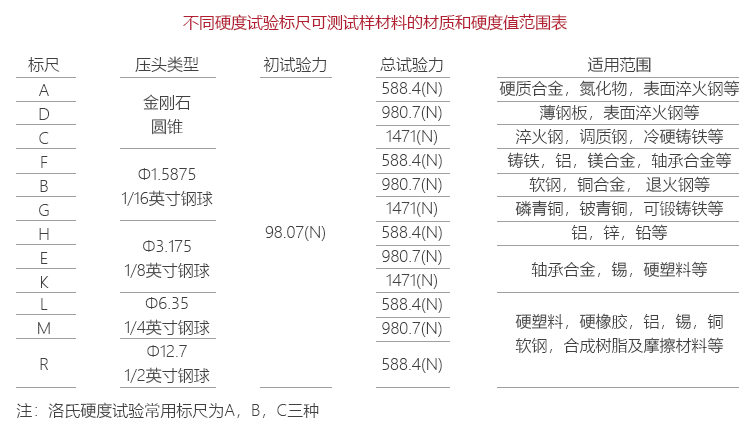 | 洛氏標(biāo)尺 | HRA、HRB、HRC、HRD、HRE、HRF、HRG、HRH、HRK、HRL、HRM、HRP、HRR、HRS、HRV |