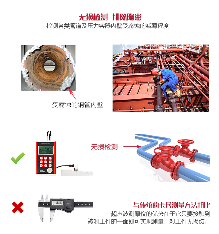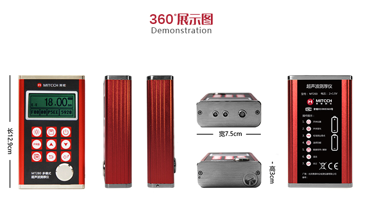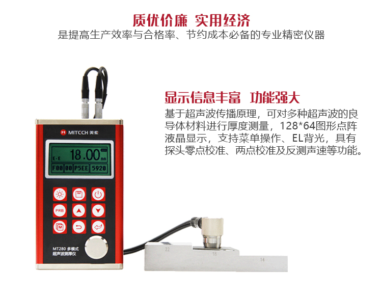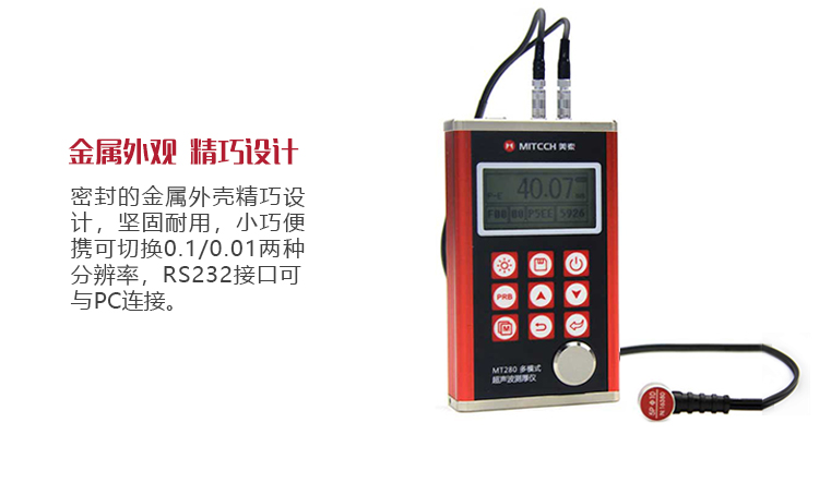 產(chǎn)品概述MT280超聲波測(cè)厚儀,基于超聲波測(cè)量原理,可對(duì)金屬、塑料、陶瓷、玻璃及其他多種超聲波的良導(dǎo)體材料進(jìn)行厚度測(cè)量,也可實(shí)現(xiàn)對(duì)材料聲速的反測(cè)。密封的金屬外殼精巧設(shè)計(jì),可防御惡劣現(xiàn)場(chǎng)環(huán)境中的油污、粉塵;與傳統(tǒng)的測(cè)量方法相比,超聲波測(cè)厚儀的優(yōu)勢(shì)在于它只要接觸到被測(cè)工件的一面即可完成測(cè)量,其獨(dú)特的無損檢測(cè)性能為封閉類管材、容器等厚度檢測(cè)受局限的工況提供了完美的解決方案。MT280兼?zhèn)浯┩竿繉幽J脚c普通模式雙效功能,測(cè)量前無需處理掉表面的涂層,可直接測(cè)量。被廣泛應(yīng)用于石油、化工、冶金、造船、航空、航天等領(lǐng)域的生產(chǎn)設(shè)備中各種管道及壓力容器腐蝕減薄程度的監(jiān)測(cè),也可用于對(duì)各種板材及各種加工零件做精確的測(cè)量。是提高生產(chǎn)效率與合格率、節(jié)約成本必備的專業(yè)精密儀器。