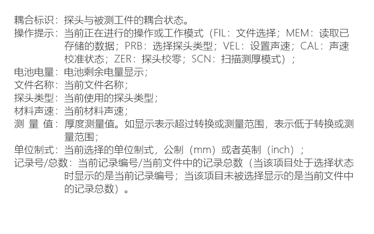 將探頭插頭插入儀器探頭插座中;按開關(guān)機(jī)鍵,伴隨著開機(jī)蜂鳴聲,儀器屏幕顯示當(dāng)前的測(cè)厚模式:“P-E”表示儀器正工作于發(fā)射-回波模式;“E-E”表示儀器正工作于回波-回波模式。停頓片刻后儀器自動(dòng)進(jìn)入測(cè)量界面,并顯示當(dāng)前儀器中設(shè)置的聲速值,此時(shí)儀器的各參數(shù)為上次關(guān)機(jī)前使用的參數(shù);若要關(guān)機(jī),僅需按一下開關(guān)機(jī)鍵即可。當(dāng)關(guān)機(jī)后,測(cè)厚儀能夠記憶它在本次使用中的全部設(shè)定參數(shù)。本儀器還有自動(dòng)關(guān)機(jī)功能來節(jié)省電池的使用。如果5分鐘內(nèi)測(cè)厚儀無任何操作,它會(huì)自動(dòng)關(guān)機(jī)。