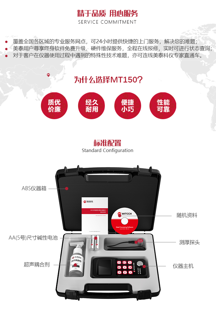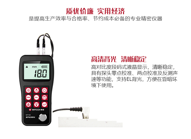 產(chǎn)品概述美泰MT150 超聲波測(cè)厚儀,基于超聲波測(cè)量原理,可對(duì)金屬、塑料、陶瓷、玻璃及其他多種超聲波的良導(dǎo)體材料進(jìn)行厚度測(cè)量,也可實(shí)現(xiàn)對(duì)材料聲速的反測(cè)。與傳統(tǒng)的測(cè)量方法相比,超聲波測(cè)厚儀的優(yōu)勢(shì)在于它只要接觸到被測(cè)工件的一面即可完成測(cè)量,其獨(dú)特的無損檢測(cè)性能為封閉類管材、容器等厚度檢測(cè)受局限的工況提供了完美的解決方案,被廣泛應(yīng)用于石油、化工、冶金、造船、航空、航天等領(lǐng)域的生產(chǎn)設(shè)備中各種管道及壓力容器腐蝕減薄程度的監(jiān)測(cè),也可用于對(duì)各種板材及各種加工零件做精確的測(cè)量。