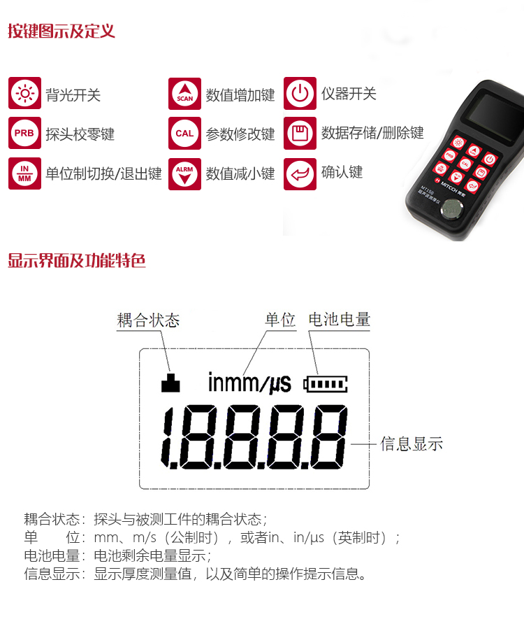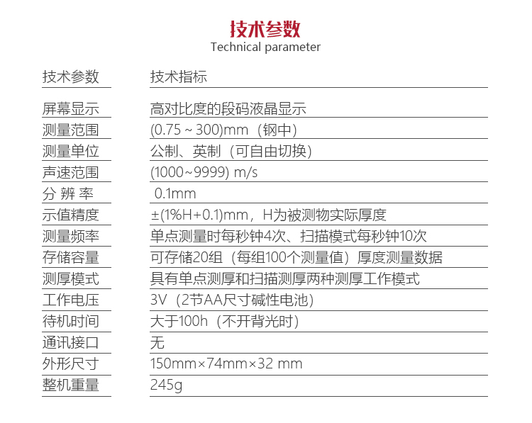 | 測(cè)量范圍 | (0.75~300)mm(鋼中),公制與英制可自由轉(zhuǎn)換 |