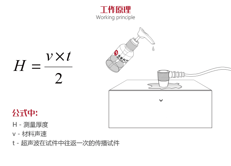 工作原理本超聲波測(cè)厚儀對(duì)厚度的測(cè)量,是由探頭產(chǎn)生超聲波脈沖透過耦合劑到達(dá)被測(cè)體,一部分超聲信號(hào)被物體底面反射,探頭接收由被測(cè)體底面反射的回波,精確地計(jì)算超聲波的往返時(shí)間,并按下式計(jì)算厚度值,再將計(jì)算結(jié)果顯示出來。