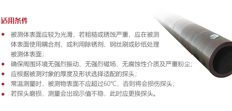 厚度測(cè)量將耦合劑均勻涂于被測(cè)區(qū)域,將探頭與被測(cè)材料表面緊密耦合,屏幕將顯示被測(cè)區(qū)域的測(cè)量厚度。當(dāng)探頭與被測(cè)材料良好耦合時(shí),屏幕將顯示耦合標(biāo)志,如果耦合標(biāo)志閃爍或無耦合標(biāo)志則表示耦合狀況不好。移開探頭后,耦合標(biāo)志消失,厚度值保持。測(cè)量中注意事項(xiàng)