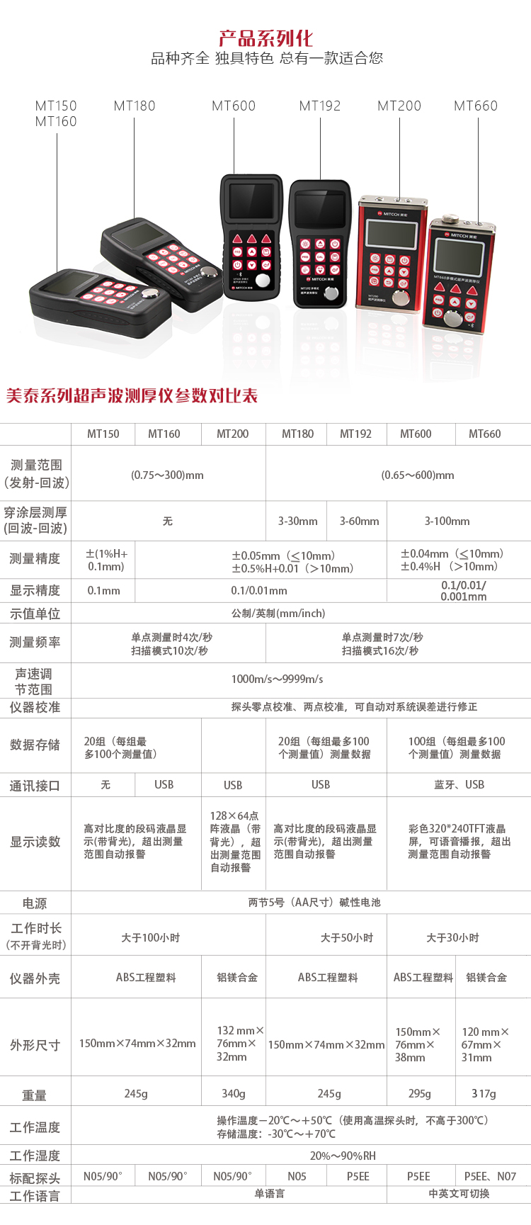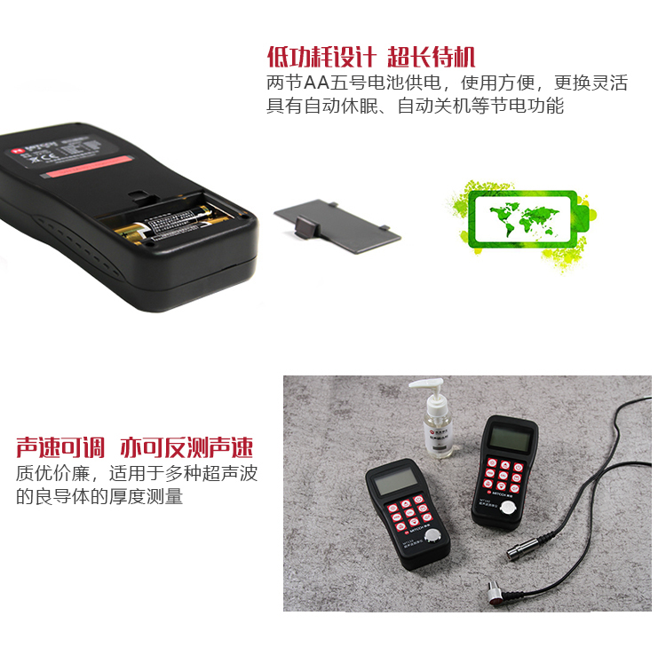 | 美泰系列超聲波測(cè)厚儀,均采用低功耗設(shè)計(jì)理念,超長(zhǎng)待機(jī),MT150/MT160/MT200/MT180/MT192/MT280/MT600/MT660均由兩節(jié)AA五號(hào)電池供電、更換方便。 | |