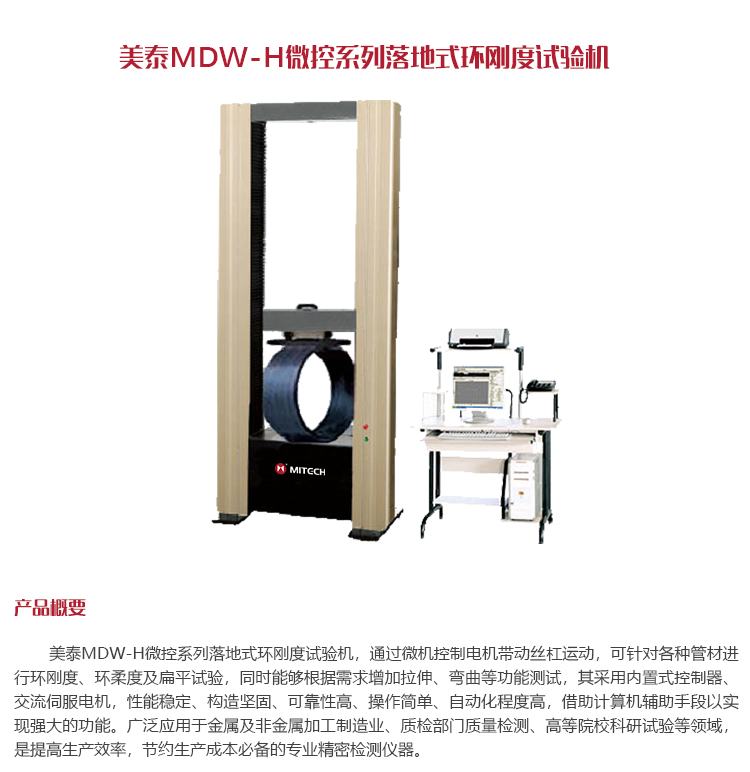 產(chǎn)品概述美泰MDW-H微控系列落地式環(huán)剛度試驗(yàn)機(jī),通過微機(jī)控制電機(jī)帶動(dòng)絲杠運(yùn)動(dòng),可針對(duì)各種管材進(jìn)行環(huán)剛度、環(huán)柔度及扁平試驗(yàn),同時(shí)能夠根據(jù)需求增加拉伸、彎曲等功能測(cè)試,其采用內(nèi)置式控制器、交流伺服電機(jī),性能穩(wěn)定、構(gòu)造堅(jiān)固、可靠性高、操作簡(jiǎn)單、自動(dòng)化程度高,借助計(jì)算機(jī)輔助手段以實(shí)現(xiàn)強(qiáng)大的功能。廣泛應(yīng)用于金屬及非金屬加工制造業(yè)、質(zhì)檢部門質(zhì)量檢測(cè)、高等院校科研試驗(yàn)等領(lǐng)域,是提高生產(chǎn)效率,節(jié)約生產(chǎn)成本必備的專業(yè)精密檢測(cè)儀器。