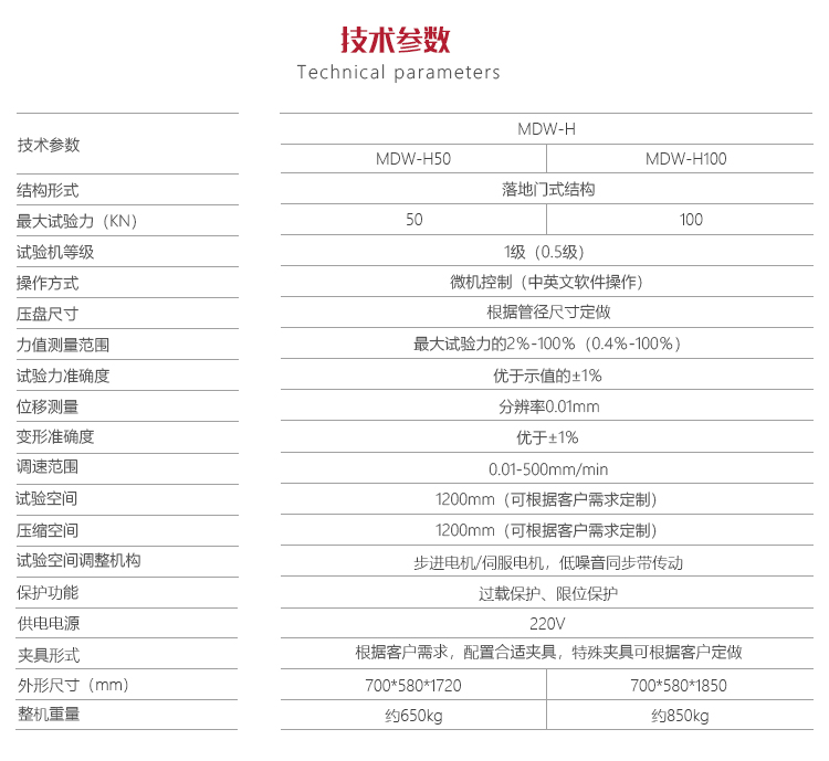 采用臺(tái)式單臂雙空間結(jié)構(gòu)來實(shí)現(xiàn)拉壓,橫梁升降可無級(jí)調(diào)速;
