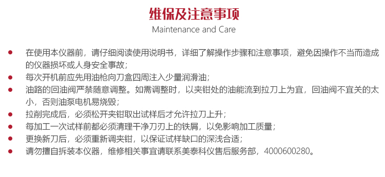每加工一次試樣前都必須清理干凈刀刃上的鐵屑,以免影響加工質(zhì)量;更換新刀后,必須重新調(diào)夾鉗,以保證試樣缺口的深淺合適;