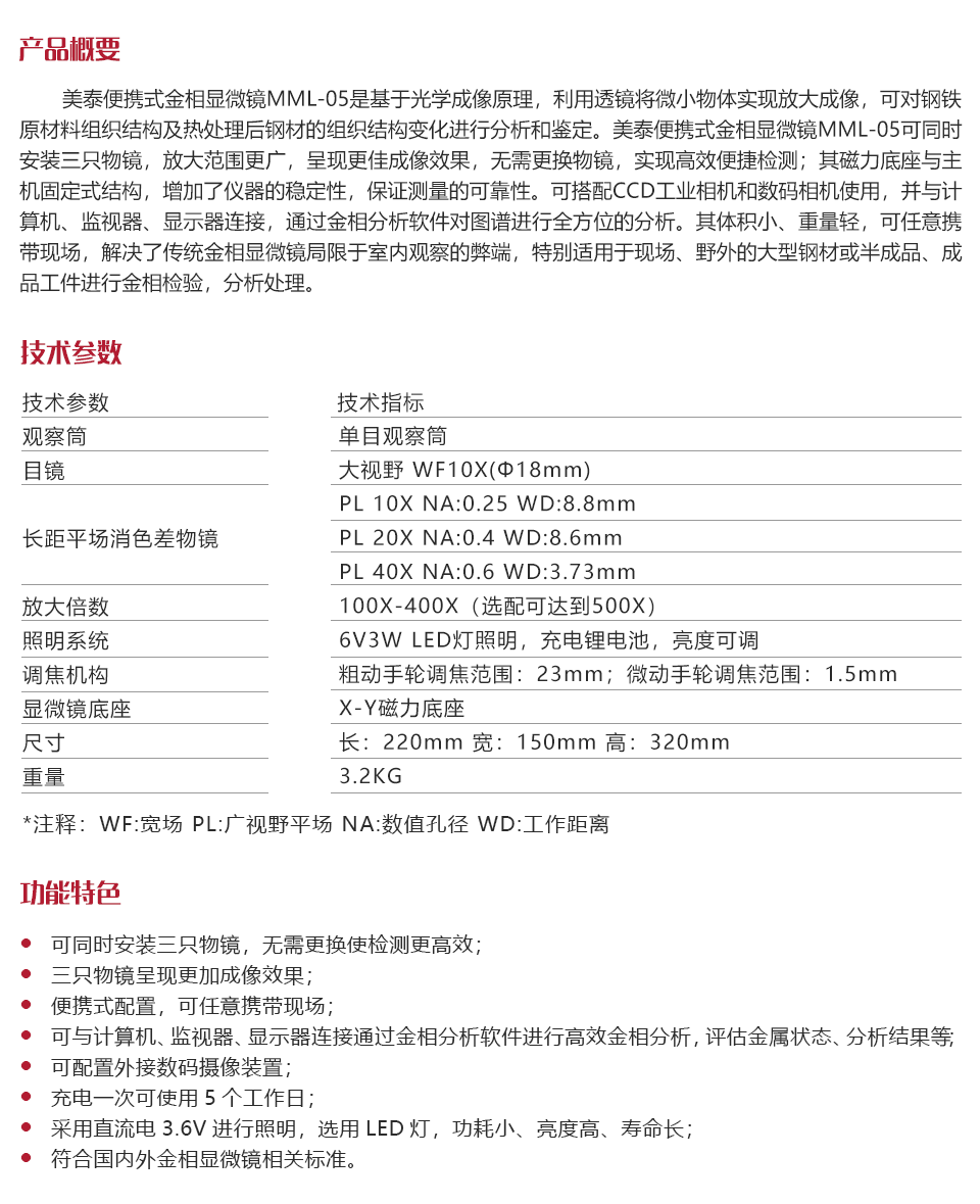 產(chǎn)品概述美泰便攜式金相顯微鏡MML-05是基于光學(xué)成像原理,利用透鏡將微小物體實(shí)現(xiàn)放大成像,可對(duì)鋼鐵原材料組織結(jié)構(gòu)及熱處理后鋼材的組織結(jié)構(gòu)變化進(jìn)行分析和鑒定。美泰便攜式金相顯微鏡MML-05可同時(shí)安裝三只物鏡,放大范圍更廣,呈現(xiàn)更佳成像效果,無(wú)需更換物鏡,實(shí)現(xiàn)高效便捷檢測(cè);其磁力底座與主機(jī)固定式結(jié)構(gòu),增加了儀器的穩(wěn)定性,保證測(cè)量的可靠性??膳渲肅CD工業(yè)相機(jī)和數(shù)碼相機(jī)使用,可與計(jì)算機(jī)、監(jiān)視器、顯示器連接,通過(guò)金相分析軟件對(duì)圖譜進(jìn)行全方位的分析。其體積小、重量輕,可任意攜帶現(xiàn)場(chǎng),解決了傳統(tǒng)金相顯微鏡局限于室內(nèi)觀察的弊端,特別適用于現(xiàn)場(chǎng)、野外的大型鋼材或半成品、成品工件進(jìn)行金相檢驗(yàn),分析處理。