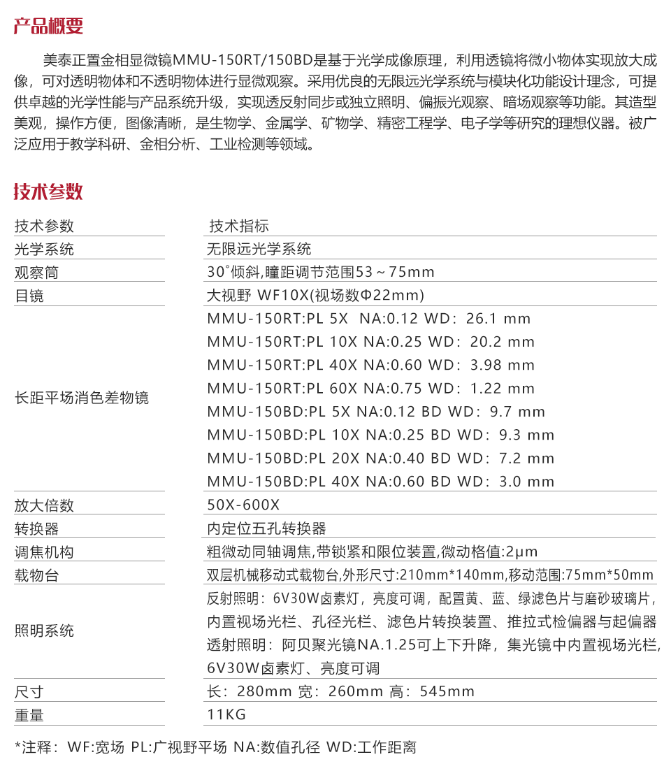 | 無限遠(yuǎn)平場消色差物鏡:MMU-150RT | PL 5X NA:0.12 WD:26.1 mm/PL 10X NA:0.25 WD:20.2 mm/PL 40X NA:0.60 WD:3.98 mm/PL 60X NA:0.75 WD:1 |