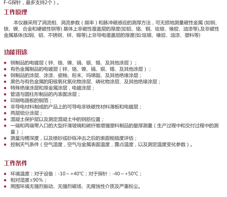 工作原理本儀器采用了渦流相、渦流參數(shù)(頻率)和脈沖磁感應(yīng)的測(cè)厚方法,可無(wú)損地測(cè)量磁性金屬 (如鋼、鐵、鎳、合金和硬磁性鋼等) 基體上非磁性覆蓋層的厚度(如鋁、鉻、銅、琺瑯、橡膠、油漆等),及非磁性金屬基體(如銅、鋁、不銹鋼、鋅、錫等)上非導(dǎo)電覆蓋層的厚度(如:琺瑯、橡膠、油漆、塑料等)