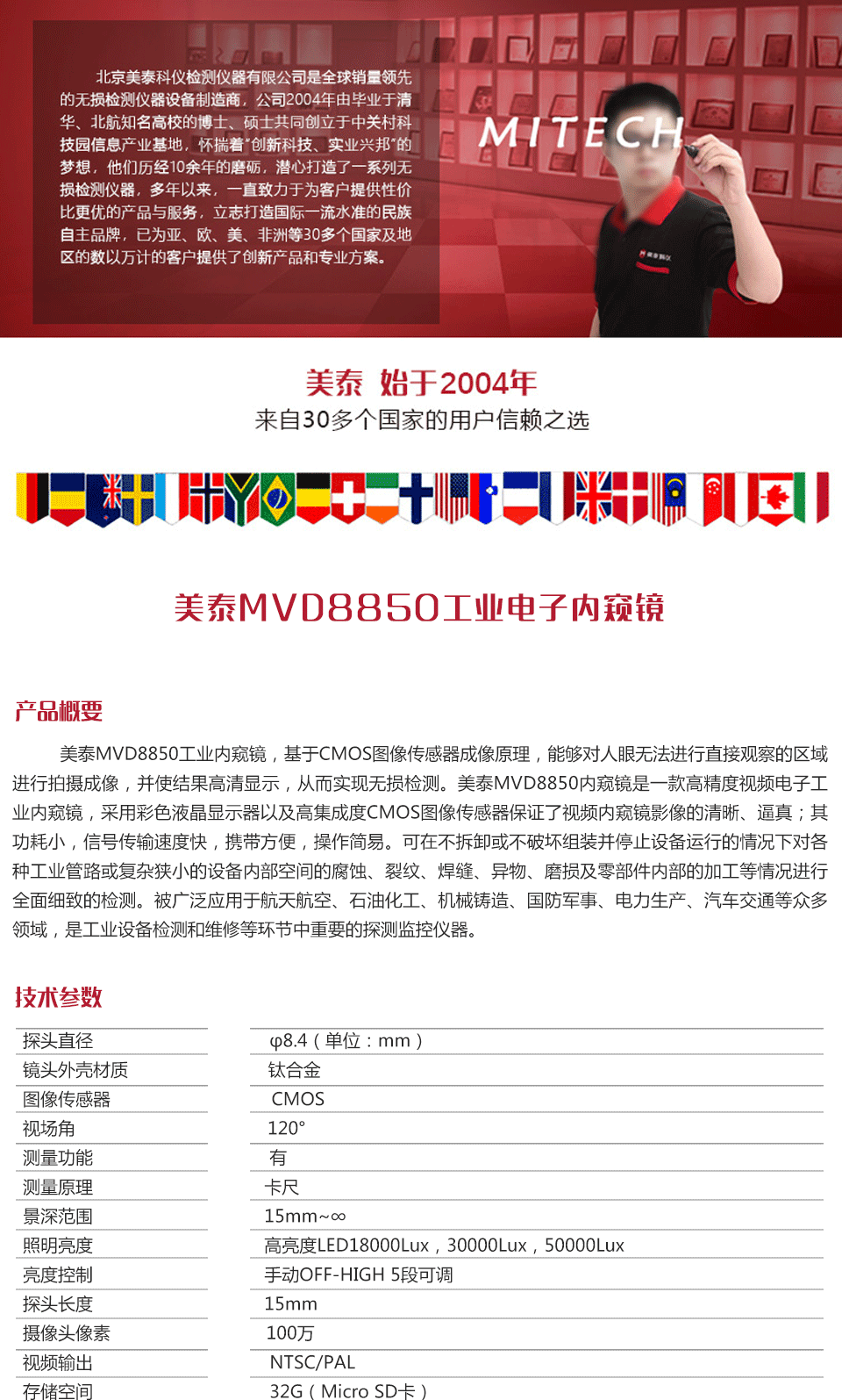 產(chǎn)品概述美泰MVD8850工業(yè)內(nèi)窺鏡,基于CMOS圖像傳感器成像原理,能夠對人眼無法進行直接觀察的區(qū)域進行拍攝成像,并使結(jié)果高清顯示,從而實現(xiàn)無損檢測。美泰MVD8850內(nèi)窺鏡是一款高精度視頻電子工業(yè)內(nèi)窺鏡,采用彩色液晶顯示器以及高集成度CMOS圖像傳感器保證了視頻內(nèi)窺鏡影像的清晰、逼真;其功耗小,信號傳輸速度快,攜帶方便,操作簡易。可在不拆卸或不破壞組裝并停止設(shè)備運行的情況下對各種工業(yè)管路或復(fù)雜狹小的設(shè)備內(nèi)部空間的腐蝕、裂紋、焊縫、異物、磨損及零部件內(nèi)部的加工等情況進行全面細致的檢測。被廣泛應(yīng)用于航天航空、石油化工、機械鑄造、國防軍事、電力生產(chǎn)、汽車交通等眾多領(lǐng)域,是工業(yè)設(shè)備檢測和維修等環(huán)節(jié)中重要的探測監(jiān)控儀器。