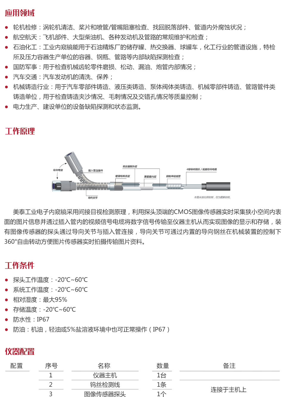 美泰工業(yè)電子內(nèi)窺鏡采用間接目視檢測原理,利用探頭頂端的CMOS圖像傳感器實時采集狹小空間內(nèi)表面的圖片信息并通過插入管內(nèi)的視頻信號電纜將數(shù)字信號傳輸至儀器主機從而實現(xiàn)圖像的顯示和存儲,裝有圖像傳感器的探頭通過導(dǎo)向關(guān)節(jié)與插入管連接,導(dǎo)向關(guān)節(jié)可通過內(nèi)置的導(dǎo)向鋼絲在機械裝置的控制下360°自由轉(zhuǎn)動方便圖片傳感器實時拍攝傳輸圖片資料。
