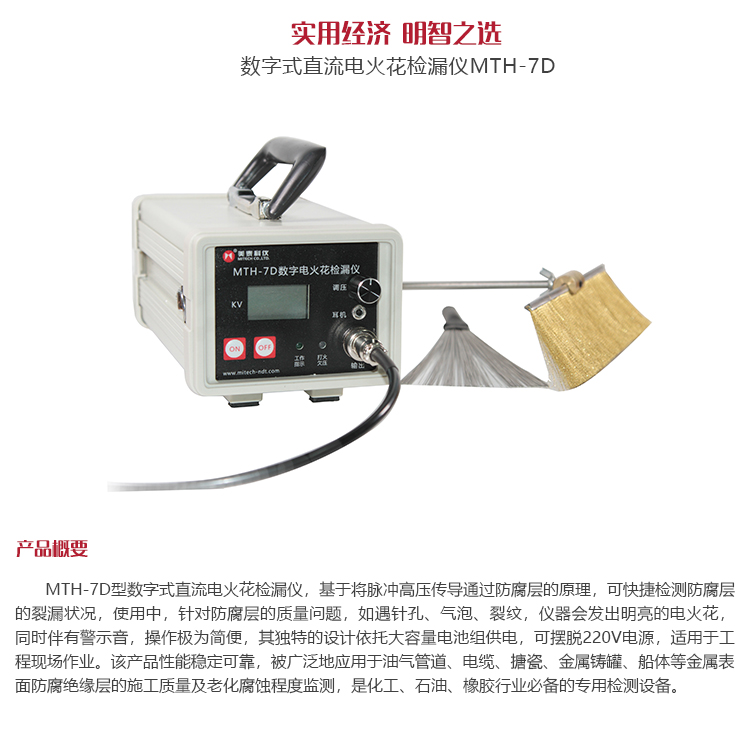 產(chǎn)品概述MTH-7D型數(shù)字式直流電火花檢漏儀,基于將脈沖高壓傳導通過防腐層的原理,可快捷檢測防腐層的裂漏狀況。使用中,針對防腐層的質(zhì)量問題,如遇針孔、氣泡、裂紋,儀器會發(fā)出明亮的電火花,同時伴有警示音,操作極為簡便,其獨特的設計依托大容量電池組供電,可擺脫220V電源,適用于工程現(xiàn)場作業(yè)。該產(chǎn)品性能穩(wěn)定可靠,被廣泛地應用于油氣管道、電纜、搪瓷、金屬鑄罐、船體等金屬表面防腐絕緣層的施工質(zhì)量及老化腐蝕程度監(jiān)測,是化工、石油、橡膠行業(yè)必備的專用檢測設備。