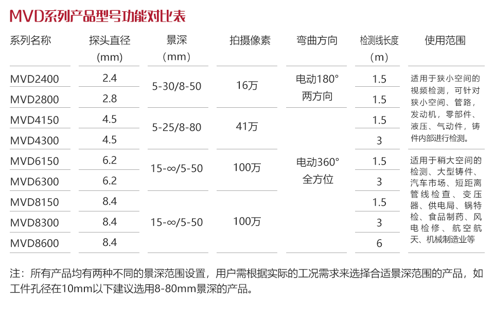 注:所有產品均有兩種不同的景深范圍設置,用戶需根據實際的工況需求來選擇合適景深范圍的產品,如工件孔徑在10mm以下建議選用8-80mm景深的產品 。
