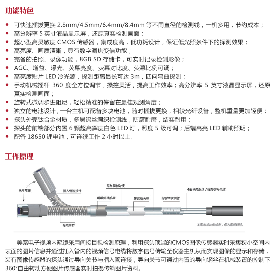 工作原理美泰電子視頻內(nèi)窺鏡采用間接目視檢測原理,利用探頭頂端的CMOS圖像傳感器實時采集狹小空間內(nèi)表面的圖片信息并通過插入管內(nèi)的視頻信號電纜將數(shù)字信號傳輸至儀器主機從而實現(xiàn)圖像的顯示和存儲,裝有圖像傳感器的探頭通過導(dǎo)向關(guān)節(jié)與插入管連接,導(dǎo)向關(guān)節(jié)可通過內(nèi)置的導(dǎo)向鋼絲在機械裝置的控制下360°自由轉(zhuǎn)動方便圖片傳感器實時拍攝傳輸圖片資料。