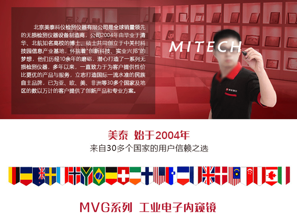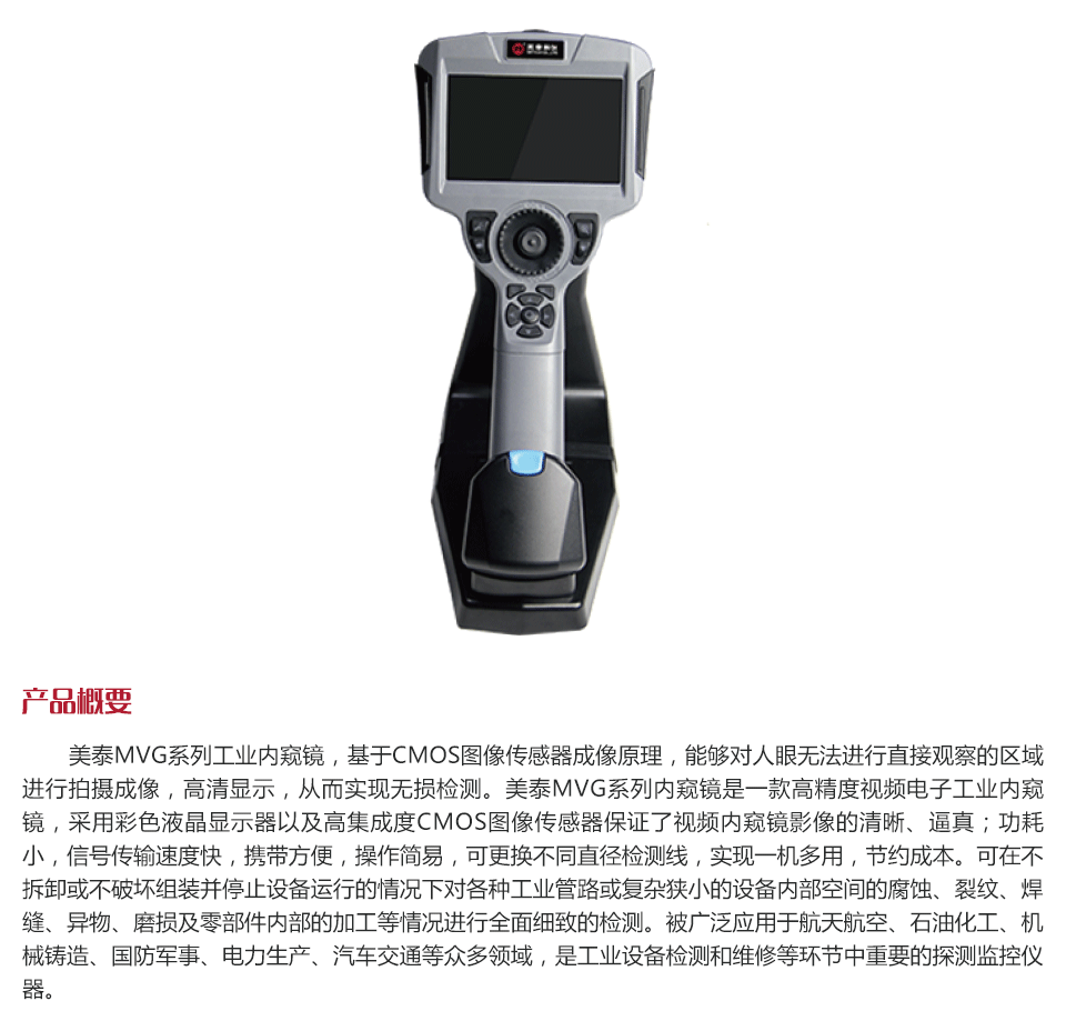 美泰MVG系列工業(yè)內(nèi)窺鏡,基于CMOS圖像傳感器成像原理,能夠對人眼無法進(jìn)行直接觀察的區(qū)域進(jìn)行拍攝成像,高清顯示,從而實現(xiàn)無損檢測。美泰MVG系列內(nèi)窺鏡是一款高精度視頻電子工業(yè)內(nèi)窺鏡,采用彩色液晶顯示器以及高集成度CMOS圖像傳感器保證了視頻內(nèi)窺鏡影像的清晰、逼真;功耗小,信號傳輸速度快,攜帶方便,操作簡易,可更換不同直徑檢測線,實現(xiàn)一機多用,節(jié)約成本。可在不拆卸或不破壞組裝并停止設(shè)備運行的情況下對各種工業(yè)管路或復(fù)雜狹小的設(shè)備內(nèi)部空間的腐蝕、裂紋、焊縫、異物、磨損及零部件內(nèi)部的加工等情況進(jìn)行全面細(xì)致的檢測。被廣泛應(yīng)用于航天航空、石油化工、機械鑄造、國防軍事、電力生產(chǎn)、汽車交通等眾多領(lǐng)域,是工業(yè)設(shè)備檢測和維修等環(huán)節(jié)中重要的探測監(jiān)控儀器。
