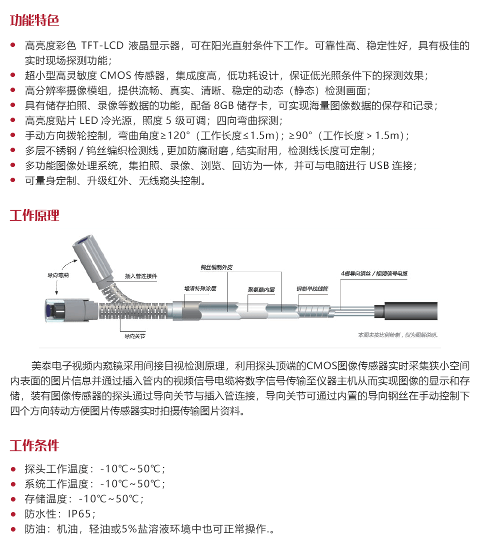 工作原理美泰電子視頻內(nèi)窺鏡采用間接目視檢測(cè)原理,利用探頭頂端的CMOS圖像傳感器實(shí)時(shí)采集狹小空間內(nèi)表面的圖片信息并通過(guò)插入管內(nèi)的視頻信號(hào)電纜將數(shù)字信號(hào)傳輸至儀器主機(jī)從而實(shí)現(xiàn)圖像的顯示和存儲(chǔ),裝有圖像傳感器的探頭通過(guò)導(dǎo)向關(guān)節(jié)與插入管連接,導(dǎo)向關(guān)節(jié)可通過(guò)內(nèi)置的導(dǎo)向鋼絲在手動(dòng)控制下四個(gè)方向轉(zhuǎn)動(dòng)方便圖片傳感器實(shí)時(shí)拍攝傳輸圖片資料。