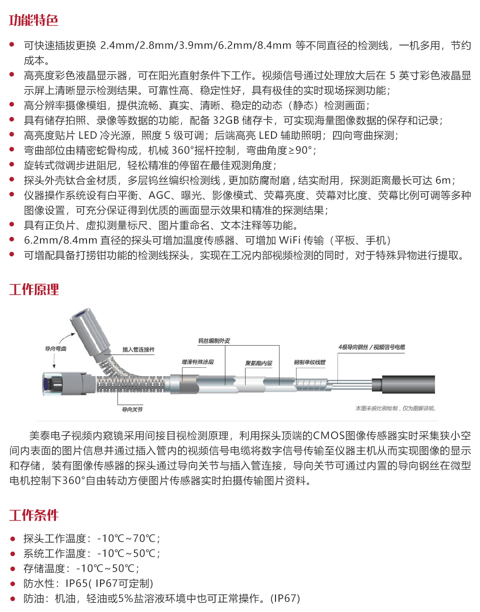 工作原理美泰電子視頻內(nèi)窺鏡采用間接目視檢測原理,利用探頭頂端的CMOS圖像傳感器實時采集狹小空間內(nèi)表面的圖片信息并通過插入管內(nèi)的視頻信號電纜將數(shù)字信號傳輸至儀器主機從而實現(xiàn)圖像的顯示和存儲,裝有圖像傳感器的探頭通過導(dǎo)向關(guān)節(jié)與插入管連接,導(dǎo)向關(guān)節(jié)可通過內(nèi)置的導(dǎo)向鋼絲在微型電機控制下360°自由轉(zhuǎn)動方便圖片傳感器實時拍攝傳輸圖片資料。