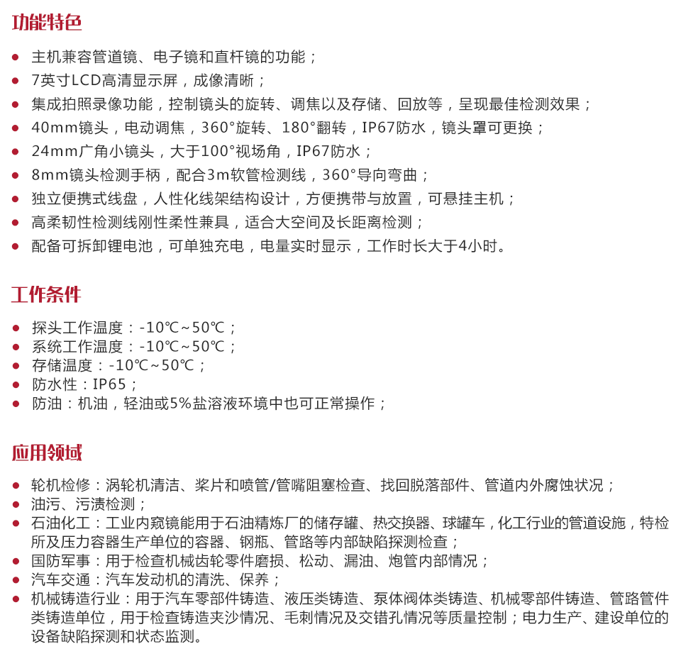 美泰MVN30三合一工業(yè)內(nèi)窺鏡是一款集管道鏡、電子鏡、超細(xì)直桿鏡于一體的工業(yè)內(nèi)窺鏡,采用彩色液晶顯示器以及高請檢測鏡頭、保證了視頻內(nèi)窺鏡影像的清晰、逼真;功耗小,信號傳輸速度快,攜帶方便,操作簡易;兼容管道鏡、電子軟管鏡和超細(xì)直桿鏡,實(shí)現(xiàn)一機(jī)多用,節(jié)約成本。檢測范圍覆蓋10mm至300mm直徑管道,最長30m檢測距離。可在不拆卸或不破壞組裝并停止設(shè)備運(yùn)行的情況下對各種工業(yè)管路或復(fù)雜狹小的設(shè)備內(nèi)部空間的腐蝕、裂紋、焊縫、異物、磨損及零部件內(nèi)部的加工等情況進(jìn)行全面細(xì)致的檢測。被廣泛應(yīng)用于航天航空、石油化工、機(jī)械鑄造、國防軍事、電力生產(chǎn)、汽車交通等眾多領(lǐng)域,是工業(yè)設(shè)備檢測和維修等環(huán)節(jié)中重要的探測監(jiān)控儀器。