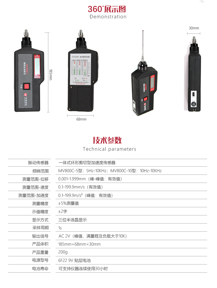產(chǎn)品概述美泰袖珍一體化測振儀MV800C系列是由壓電式傳感器和數(shù)字顯示電路組成的手持式測振儀表,主要用于測量各種旋轉(zhuǎn)機(jī)械的振動加速度、速度和位移。MV800C系列分兩種型號MV800C-5(頻響范圍:5Hz~10KHz)和MV800C-10(頻響范圍:10Hz~10KH),可滿足常規(guī)測振使用需求以及低頻振動測量需求。該產(chǎn)品測量范圍廣,顯示直觀、一體化的設(shè)計(jì)體積小、重量輕,測量攜帶方便,特別適用于野外無電源的現(xiàn)場作業(yè)及高空作業(yè),大大減少工作人員的工作強(qiáng)度,提高工作效率。