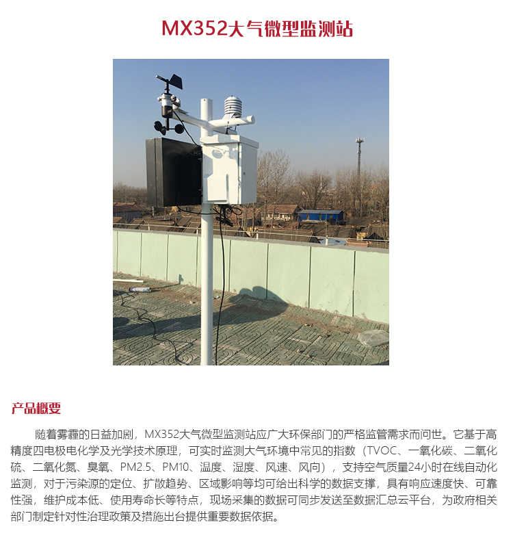 產(chǎn)品概述隨著霧霾的日益加劇,MX352大氣微型監(jiān)測(cè)站應(yīng)廣大環(huán)保部門的嚴(yán)格監(jiān)管需求而問世。它基于高精度四電極電化學(xué)及光學(xué)技術(shù)原理,可實(shí)時(shí)監(jiān)測(cè)大氣環(huán)境中常見的指數(shù)(TVOC、一氧化碳、二氧化硫、二氧化氮、臭氧、PM2.5、PM10、溫度、濕度、風(fēng)速、風(fēng)向),支持空氣質(zhì)量24小時(shí)在線自動(dòng)化監(jiān)測(cè),對(duì)于污染源的定位、擴(kuò)散趨勢(shì)、區(qū)域影響等均可給出科學(xué)的數(shù)據(jù)支撐,具有響應(yīng)速度快、可靠性強(qiáng),維護(hù)成本低、使用壽命長(zhǎng)等特點(diǎn),現(xiàn)場(chǎng)采集的數(shù)據(jù)可同步發(fā)送至數(shù)據(jù)匯總云平臺(tái),為政府相關(guān)部門制定針對(duì)性治理政策及措施出臺(tái)提供重要數(shù)據(jù)依據(jù)。