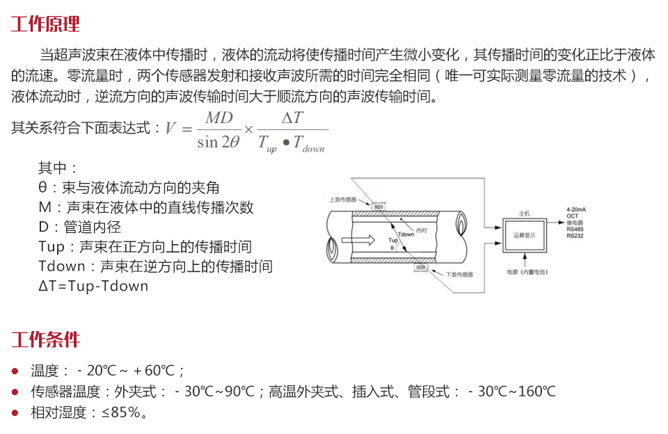 工作原理當(dāng)超聲波束在液體中傳播時,液體的流動將使傳播時間產(chǎn)生微小變化,其傳播時間的變化正比于液體的流速。零流量時,兩個傳感器發(fā)射和接收聲波所需的時間完全相同(唯一可實際測量零流量的技術(shù)),液體流動時,逆流方向的聲波傳輸時間大于順流方向的聲波傳輸時間。