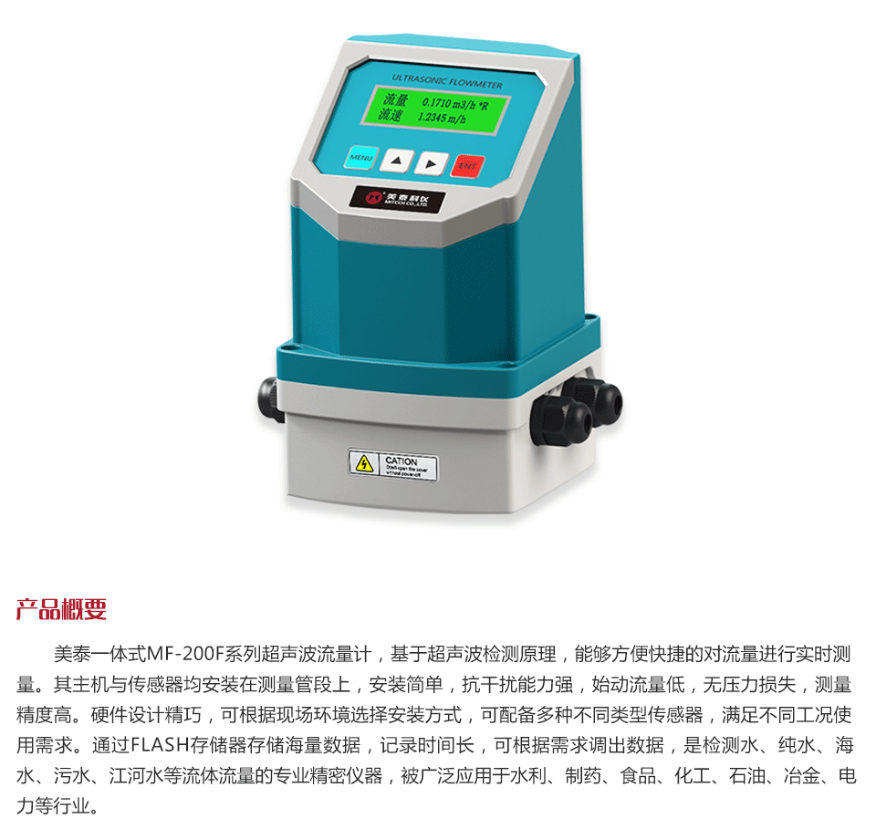 產(chǎn)品概述美泰一體式MF-200F系列超聲波流量計,基于超聲波檢測原理,能夠方便快捷的對流量進行實時測量。其主機與傳感器均安裝在測量管段上,安裝簡單,抗干擾能力強,始動流量低,無壓力損失,測量精度高。硬件設(shè)計精巧,可根據(jù)現(xiàn)場環(huán)境選擇安裝方式,可配備多種不同類型傳感器,滿足不同工況使用需求。通過FLASH存儲器存儲海量數(shù)據(jù),記錄時間長,可根據(jù)需求調(diào)出數(shù)據(jù),是檢測水、純水、海水、污水、江河水等流體流量的專業(yè)精密儀器,被廣泛應(yīng)用于水利、制藥、食品、化工、石油、冶金、電力等行業(yè)。