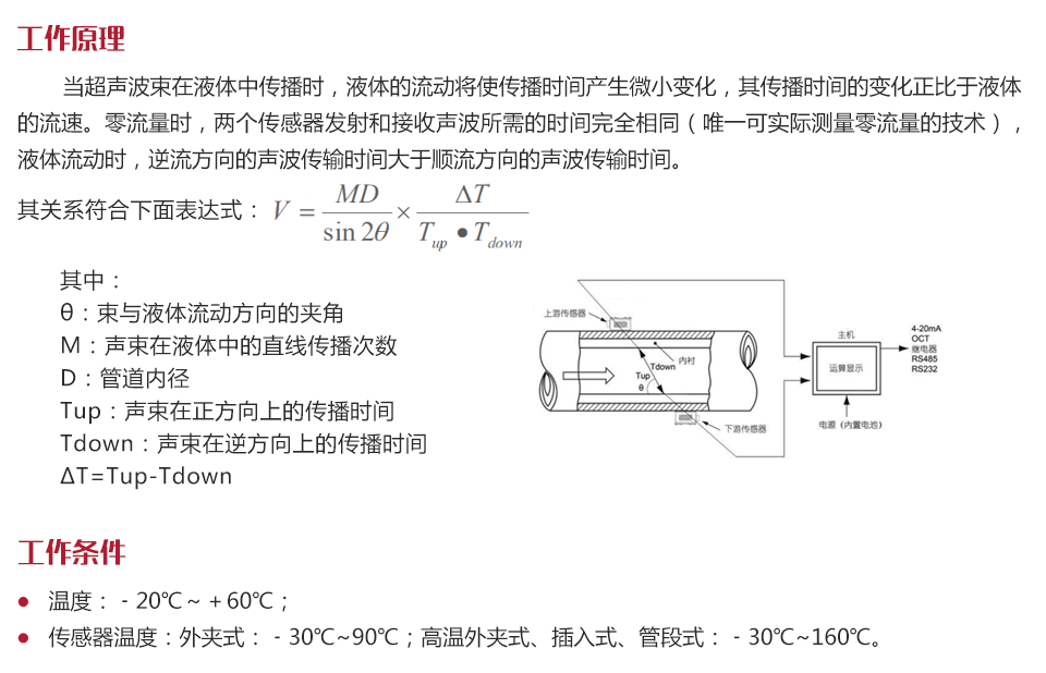 工作原理當(dāng)超聲波束在液體中傳播時,液體的流動將使傳播時間產(chǎn)生微小變化,其傳播時間的變化正比于液體的流速。零流量時,兩個傳感器發(fā)射和接收聲波所需的時間完全相同(唯一可實際測量零流量的技術(shù)),液體流動時,逆流方向的聲波傳輸時間大于順流方向的聲波傳輸時間。