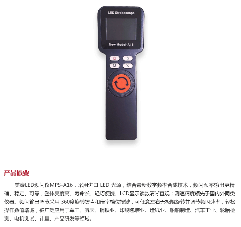美泰LED頻閃儀MPS-A16,采用進(jìn)口 LED 光源,結(jié)合最新數(shù)字頻率合成技術(shù),頻閃頻率輸出更精確、穩(wěn)定、可靠,整體亮度高、壽命長、輕巧便攜、LCD顯示讀數(shù)清晰直觀;測速精度領(lǐng)先于國內(nèi)外同類儀器。頻閃輸出調(diào)節(jié)采用 360 度旋轉(zhuǎn)撥盤和倍率檔位按鍵,可任意左右無極限旋轉(zhuǎn)并調(diào)節(jié)頻閃速率,輕松操作數(shù)值增減,被廣泛應(yīng)用于軍工、航天、鋼鐵業(yè)、印刷包裝業(yè)、造紙業(yè)、船舶制造、汽車工業(yè)、輪胎檢測、電機(jī)測試、計量、產(chǎn)品研發(fā)等領(lǐng)域。