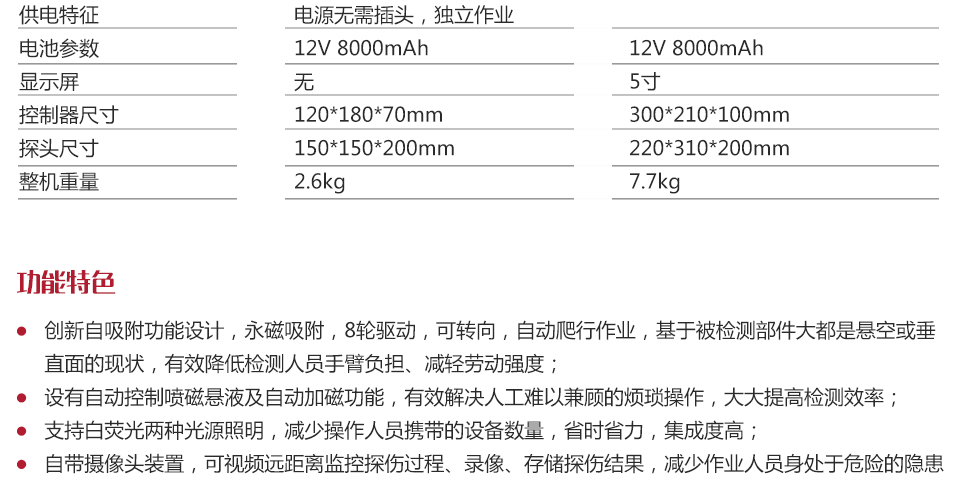 儀器特點? 創(chuàng)新自吸附功能設(shè)計,永磁吸附,8輪驅(qū)動,可轉(zhuǎn)向,自動爬行作業(yè),基于被檢測部件大都是懸空或垂直面的現(xiàn)狀,有效降低檢測人員手臂負擔、減輕勞動強度;