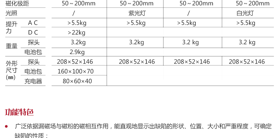 ? 白光配置的CJE220D可進行普通磁粉探傷,紫光配置的CDX220可進行紫光磁粉探傷,磁軛間距可調節(jié),一體化設計結構緊湊、布局合理、體積小巧、方便攜帶,可滿足不同用戶的不同需求;