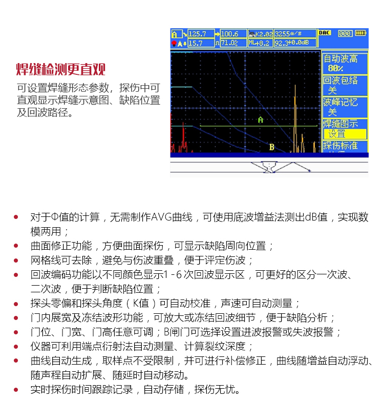 | 缺陷定量 | 缺陷當(dāng)量dB值實(shí)時(shí)顯示 |