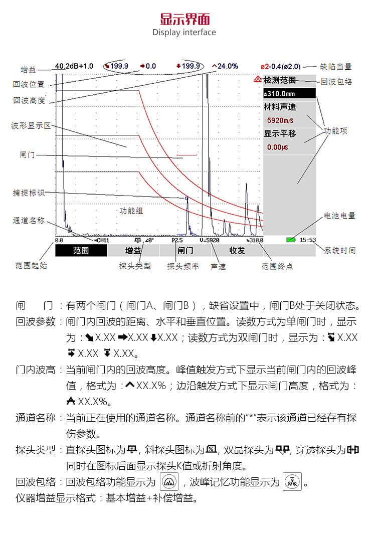 | 回波編碼 | 以不同顏色顯示1~6次回波顯示區(qū),便于判斷缺陷位置 |