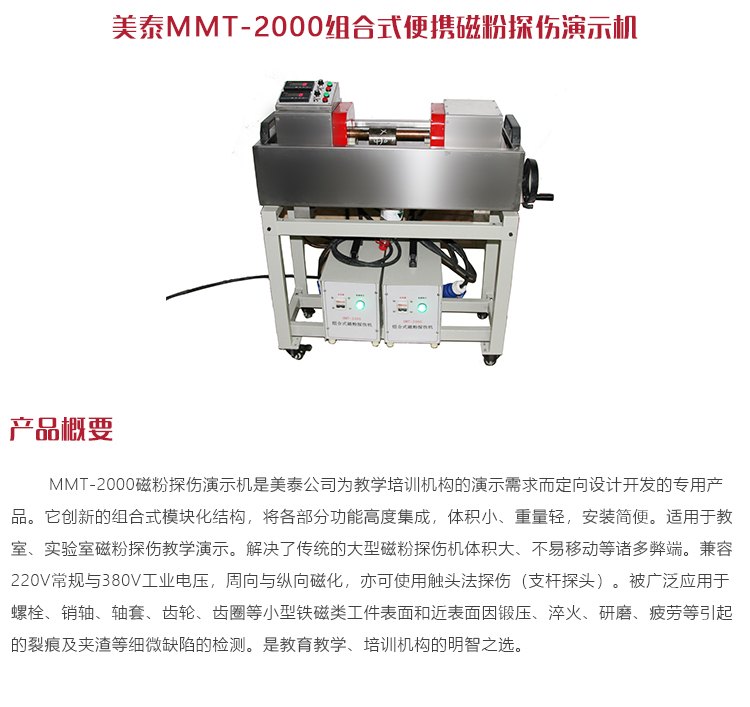 產(chǎn)品概述MMT-2000磁粉探傷演示機是美泰公司為教學培訓機構的演示需求而定向設計開發(fā)的專用產(chǎn)品。它創(chuàng)新的組合式模塊化結(jié)構,將各部分功能高度集成,體積小、重量輕,安裝簡便。適用于教室、實驗室磁粉探傷教學演示。解決了傳統(tǒng)的大型磁粉探傷機體積大、不易移動等諸多弊端。兼容220V常規(guī)與380V工業(yè)電壓,周向與縱向磁化,亦可使用觸頭法探傷(支桿探頭)。被廣泛應用于螺栓、銷軸、軸套、齒輪、齒圈等小型鐵磁類工件表面和近表面因鍛壓、淬火、研磨、疲勞等引起的裂痕及夾渣等細微缺陷的檢測。是教育教學、培訓機構的明智之選。