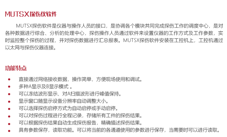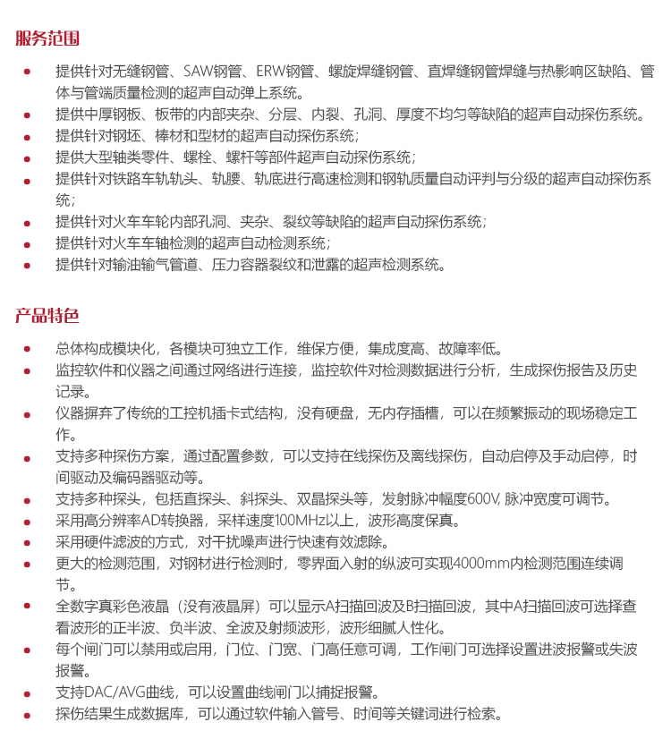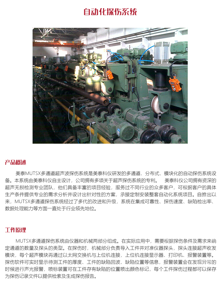 產(chǎn)品概述美泰MUTSX多通道超聲波探傷系統(tǒng)是美泰科儀研發(fā)的多通道、分布式、模塊化的自動(dòng)探傷系統(tǒng)設(shè)備。本系統(tǒng)由美泰科儀自主設(shè)計(jì),公司擁有多項(xiàng)關(guān)于超聲探傷系統(tǒng)的專利。 美泰科儀公司擁有資深的超聲無(wú)損檢測(cè)專業(yè)團(tuán)隊(duì),他們具備豐富的項(xiàng)目經(jīng)驗(yàn),服務(wù)過(guò)不同行業(yè)的眾多客戶,可根據(jù)客戶的具體生產(chǎn)條件提供專業(yè)的需求分析并設(shè)計(jì)出針對(duì)性的方案,承接定制安裝整套自動(dòng)化系統(tǒng)項(xiàng)目。自推出以來(lái),MUTSX多通道探傷系統(tǒng)經(jīng)過(guò)了多代的改進(jìn)和升級(jí),系統(tǒng)在集成可靠性、探傷速度、缺陷檢出率、數(shù)據(jù)處理能力等方面一直處于行業(yè)領(lǐng)先地位。