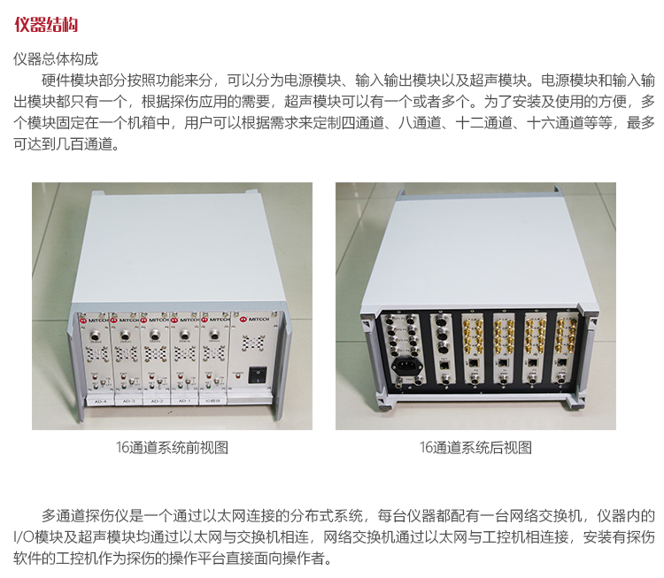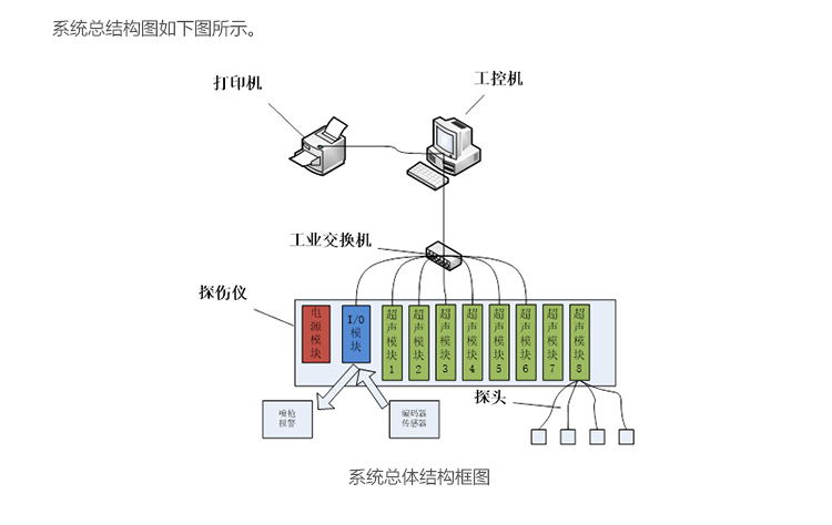 工作原理MUTSX多通道探傷系統(tǒng)由儀器和機(jī)械兩部分組成。在實(shí)際應(yīng)用中,需要根據(jù)探傷條件及需求來(lái)確定通道的數(shù)量及探頭的類型。 在探傷時(shí),機(jī)械部分負(fù)責(zé)導(dǎo)入工件并對(duì)準(zhǔn)儀器探頭,探頭連接超聲收發(fā)模塊,每個(gè)超聲模塊再通過(guò)以太網(wǎng)交換機(jī)與上位機(jī)連接,上位機(jī)連接顯示器、打印機(jī)、報(bào)警裝置等。 探傷軟件可實(shí)時(shí)顯示待測(cè)工件的厚度、工件的缺陷回波、缺陷位置等信息,報(bào)警裝置會(huì)在發(fā)現(xiàn)異常的時(shí)候進(jìn)行聲光報(bào)警,噴標(biāo)裝置可在工件存有缺陷的位置噴出顏色標(biāo)記,每個(gè)工件探傷過(guò)程都可以保存為探傷記錄文件以提供檢索及生成探傷報(bào)告。