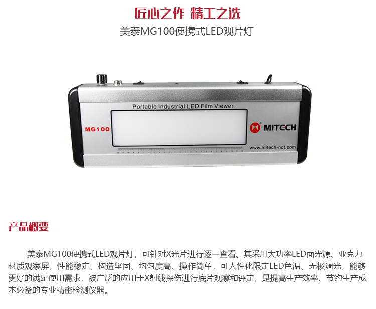 產品概述美泰MG100便攜式LED觀片燈,可針對X光片進行逐一查看。其采用大功率LED面光源、亞克力材質觀察屏,性能穩(wěn)定、構造堅固、均勻度高、操作簡單,可人性化限定LED色溫、無極調光,能夠更好的滿足使用需求,被廣泛的應用于X射線探傷進行底片觀察和評定,是提高生產效率、節(jié)約生產成本必備的專業(yè)精密檢測儀器。