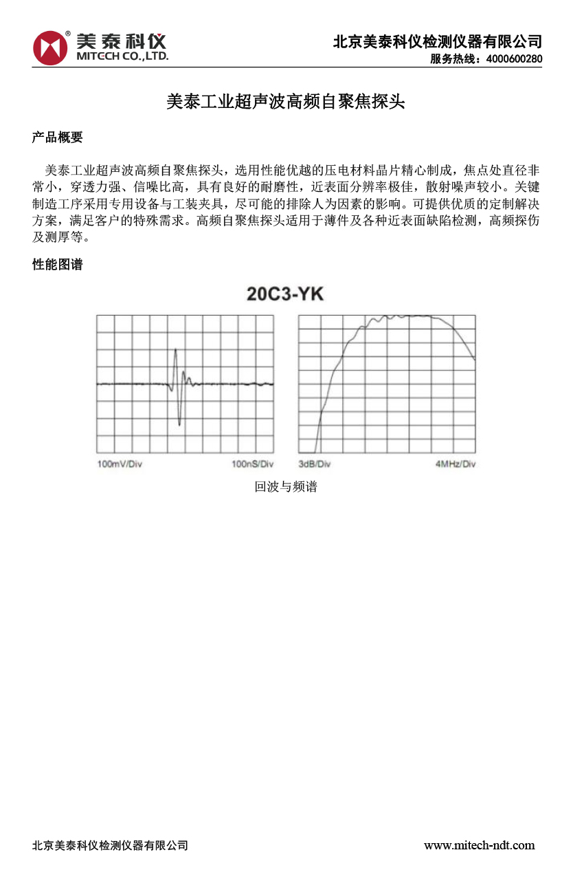 美泰工業(yè)超聲波高頻自聚焦探頭,選用性能優(yōu)越的壓電材料晶片精心制成,焦點(diǎn)處直徑非常小,穿透力強(qiáng)、信噪比高,具有良好的耐磨性,近表面分辨率極佳,散射噪聲較小。關(guān)鍵制造工序采用專用設(shè)備與工裝夾具,盡可能的排除人為因素的影響??商峁﹥?yōu)質(zhì)的定制解決方案,滿足客戶的特殊需求。高頻自聚焦探頭適用于薄件及各種近表面缺陷檢測(cè),高頻探傷及測(cè)厚等。