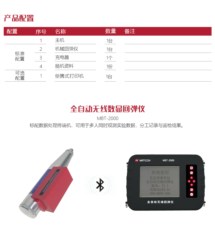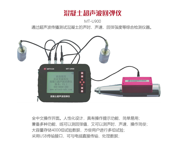 工作原理美泰MT-U900混凝土超聲波回彈儀,是一款功能強大的混凝土綜合檢測儀器。除具備普通回彈儀的強度測試功能外,可通過超聲波傳播測試混凝土的聲時、聲速等數(shù)值。其采用進口傳感器及先進的ARM處理器,測量快速準確,適用于各類建筑工程中普通混凝土抗壓強度的無損檢測,是保障工程質(zhì)量、節(jié)約生產(chǎn)成本必備的精密檢測儀器。
