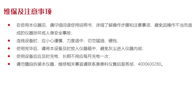 l 請勿擅自拆裝本儀器,維修相關(guān)事宜請聯(lián)系美泰科儀售后服務(wù)部,4000600280。